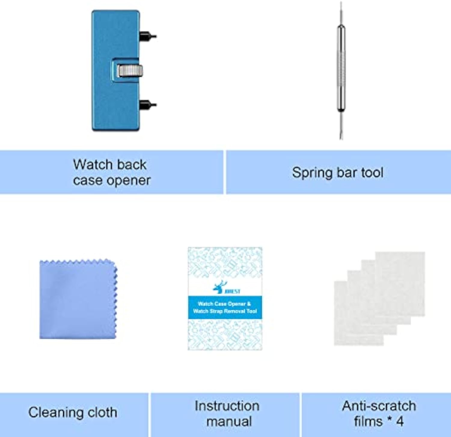 - 【JOREST Watch Battery Replacement Kit】-- This kit consists of a watch back case opener, a spring bar tool, anti-scratch films*4 and a cleaning cloth. It can help you open the watch cover to replace the watch battery and change the watch strap.
