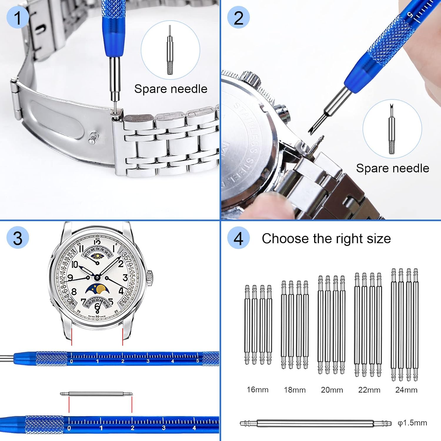 - 【Adjust the strap】- Metal watch band link remover, watch band holder, pin punches, double-headed hammer and spring bar tool with scale are used to replace various watch straps, adjust the length of the strap to fit your wrist.We are equipped with 15PCS spare needle to improve the service life of the tool, suitable for pin punch and metal watch band link remover.