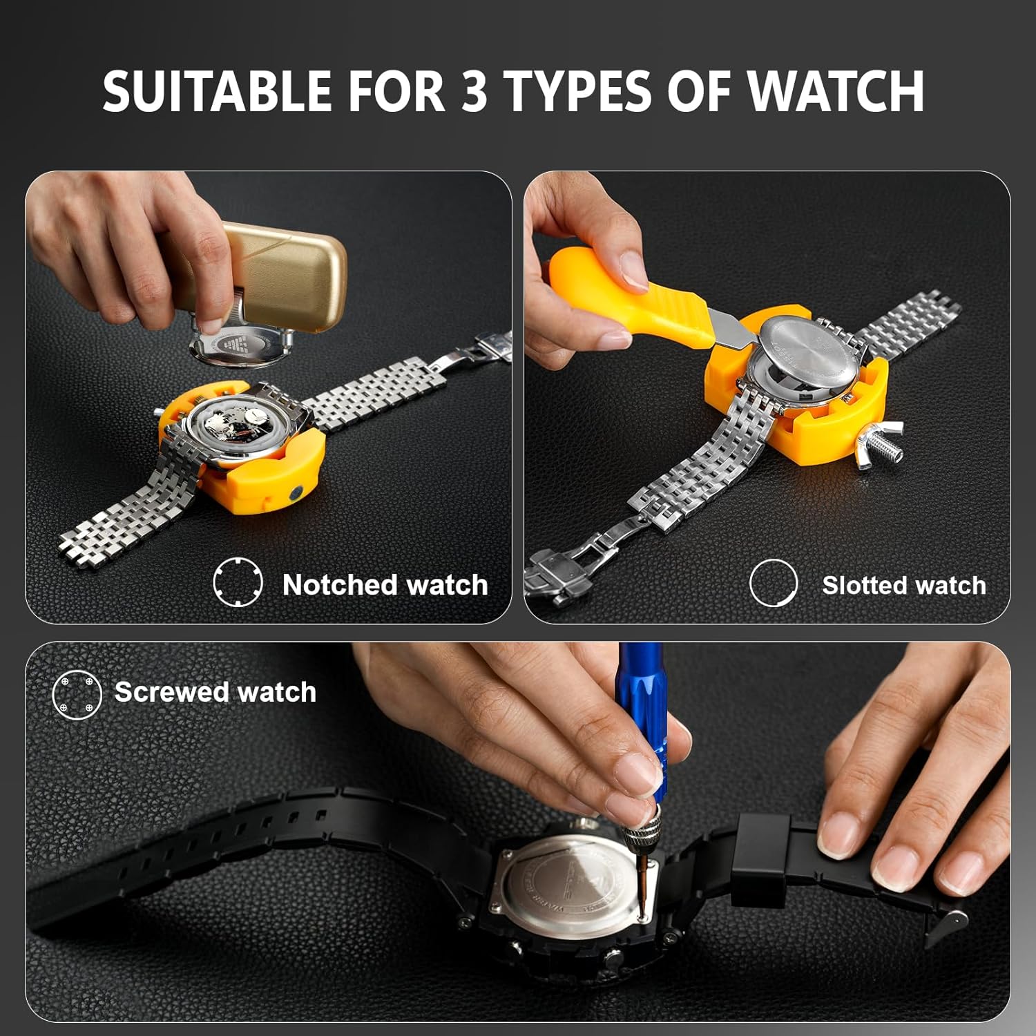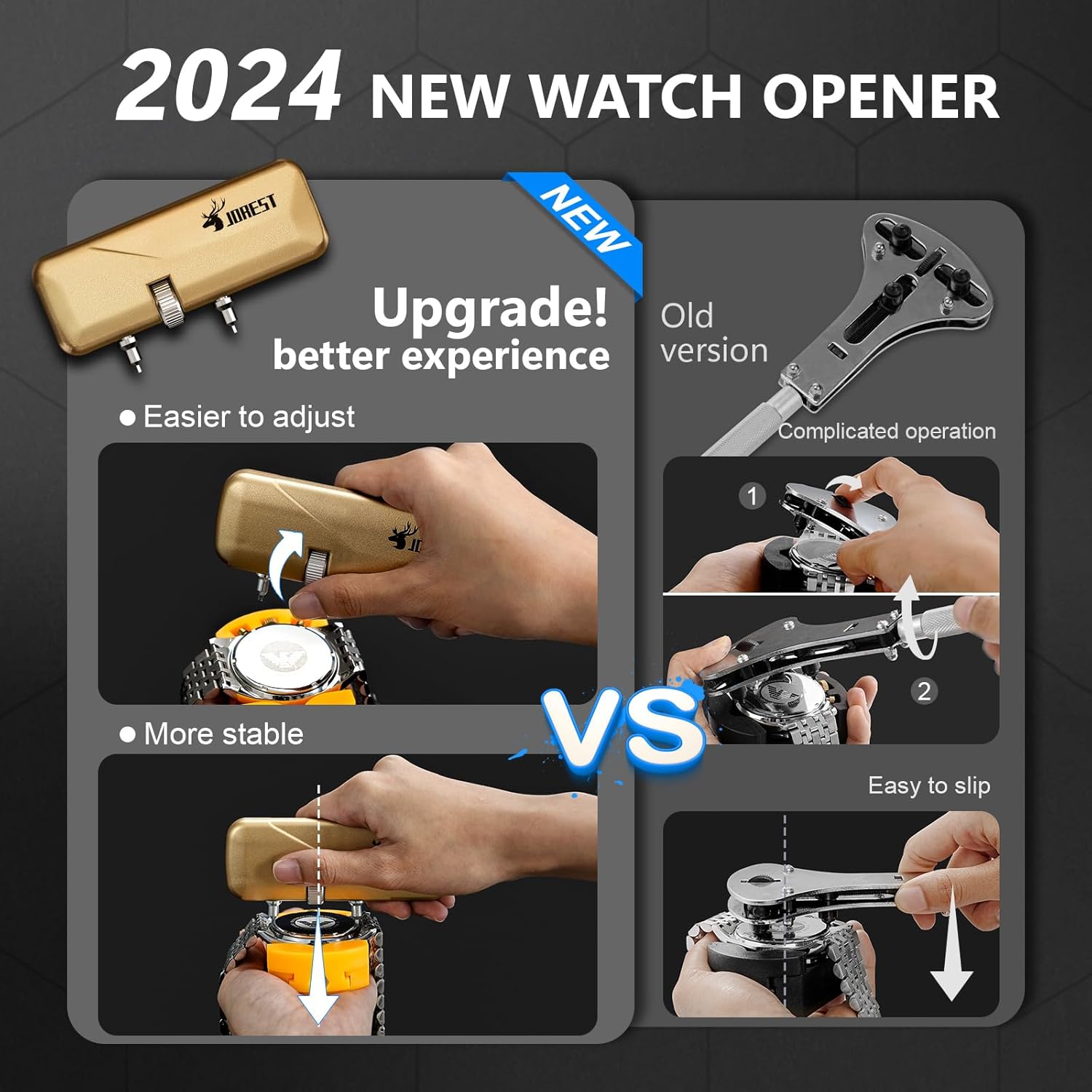 - 【2024 New Watch Opener & Presser】①The upgraded rotary watch opener is more stable and larger in size for a more comfortable grip; ②The new watch presser is more stable, more accurate and less labor intensive, so even women can do the job easily.