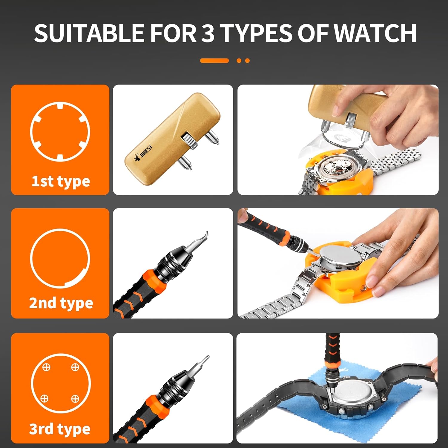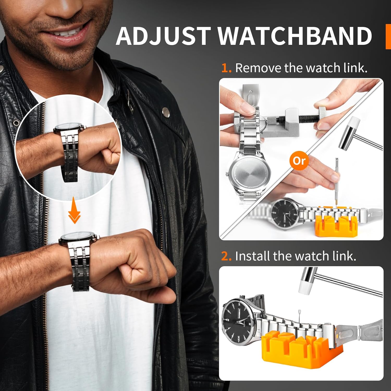 - 【Replace the Watch Battery & Adjust the Watch Band】Suitable for watch backs with a pry opening, watch backs with grooves or watch backs with screws; The metal link remover and hammer tool can help you adjust the strap length to fit your wrist.